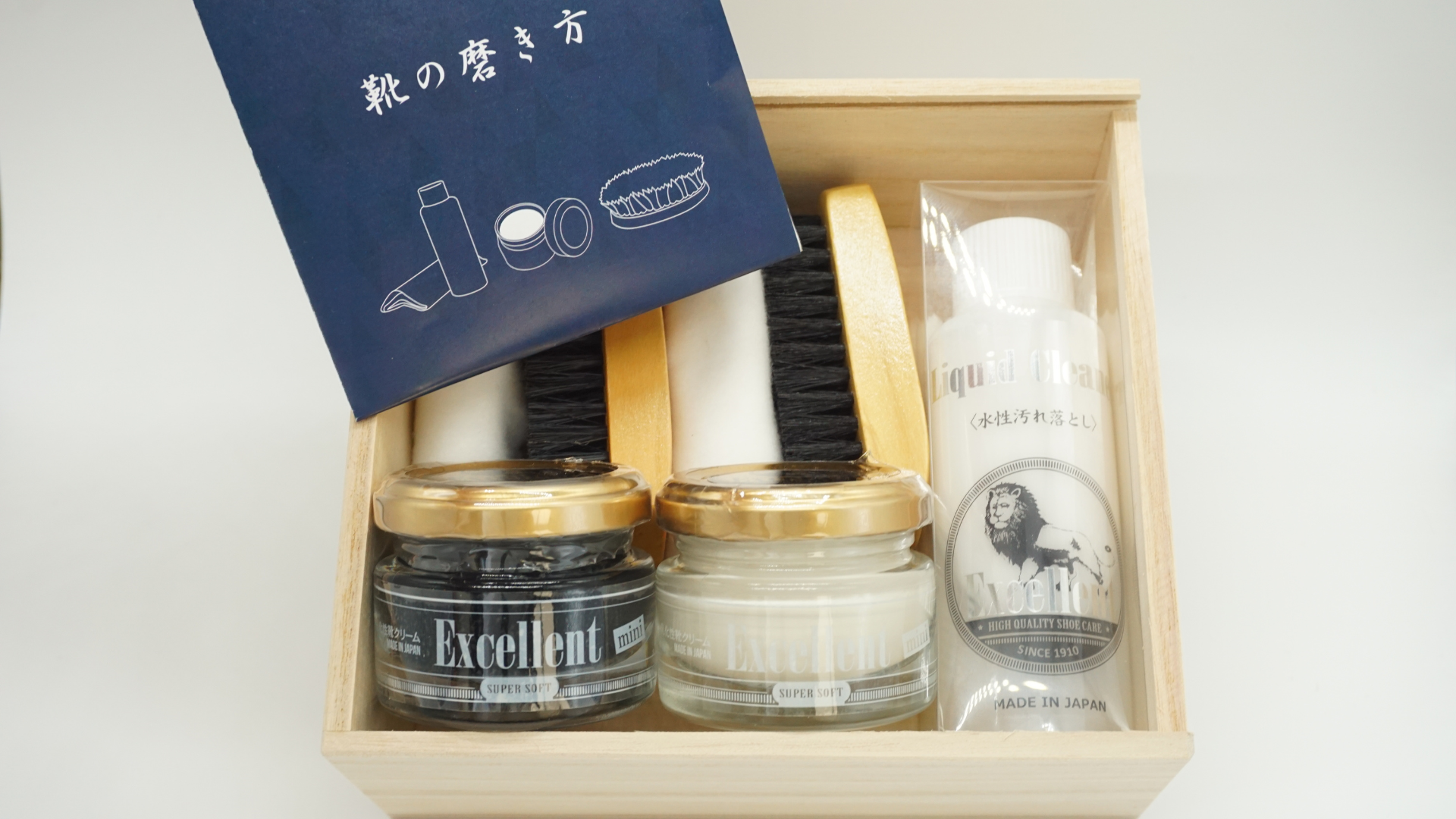 エクセレントミニシューケアボックスは、「汚れ落とし、保湿」までの工程を行えるセット品です。