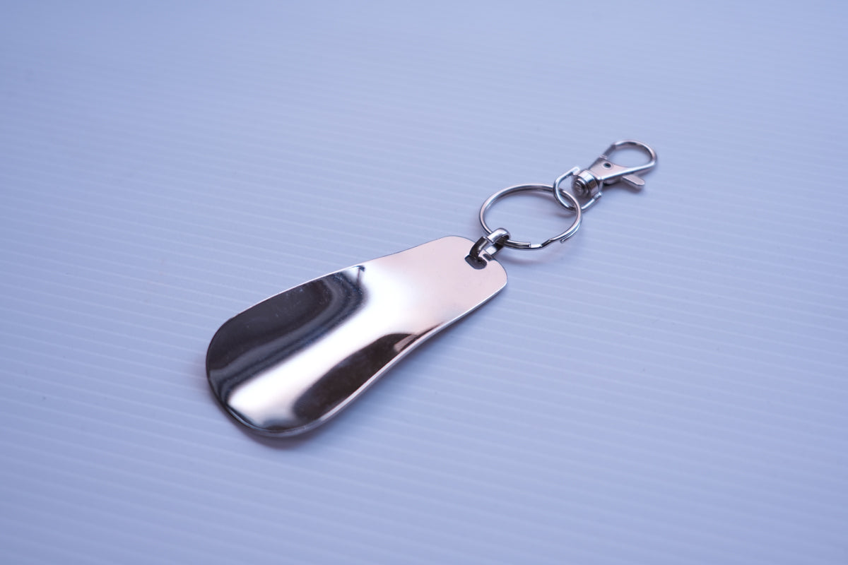 ステンレス製のキーホルダー付きミニ靴べらです。