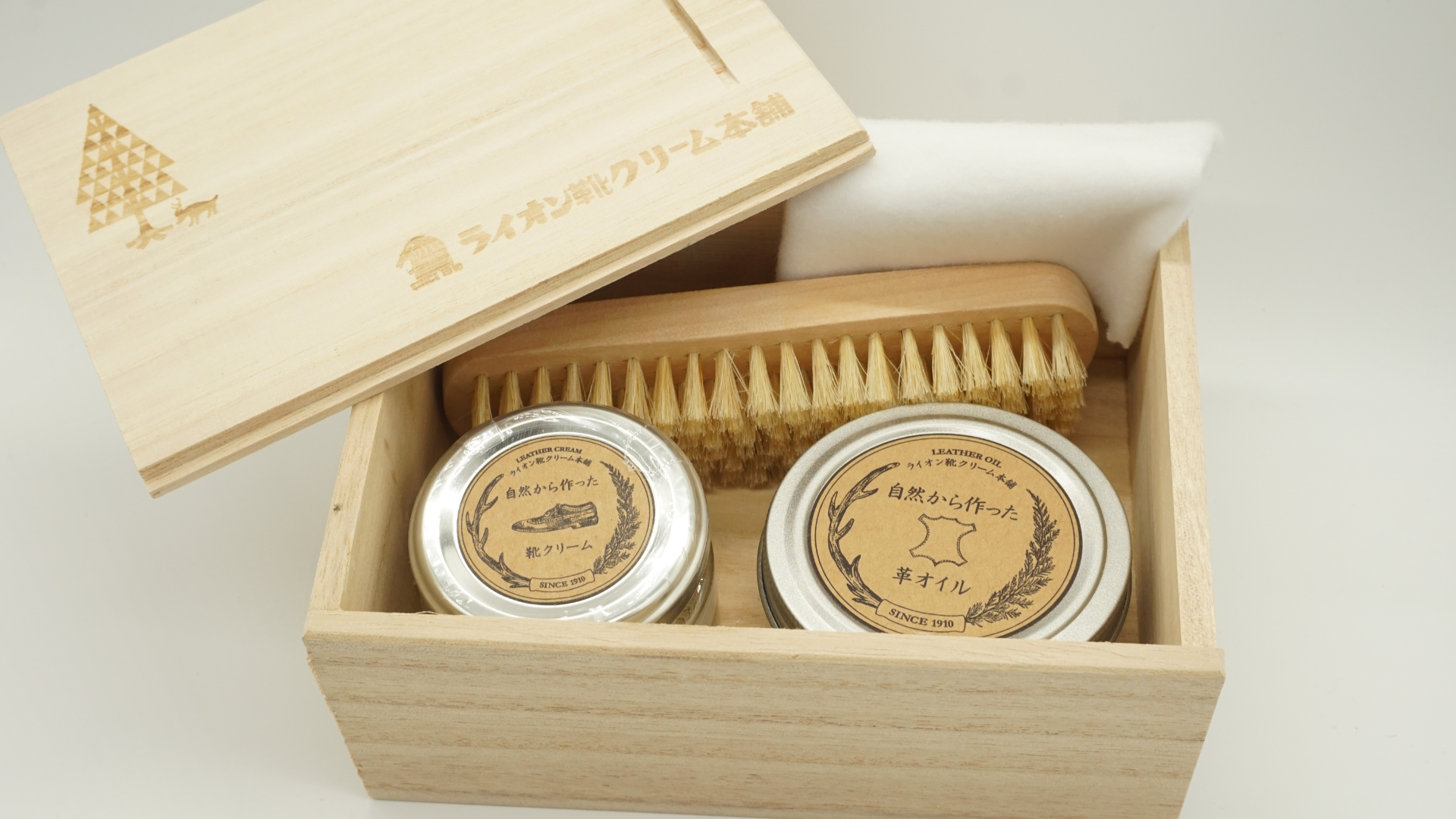 靴磨きだけでなく、革製品に対応するケア用品が入った桐箱入りケアセット