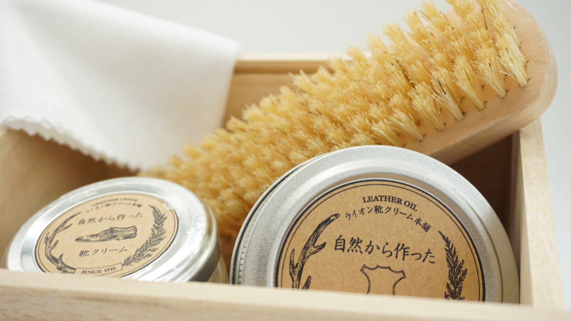 自然から作ったシリーズの靴磨きに使用する靴クリームと、革のお手入れに使用する革オイルが揃ったケアセットです。