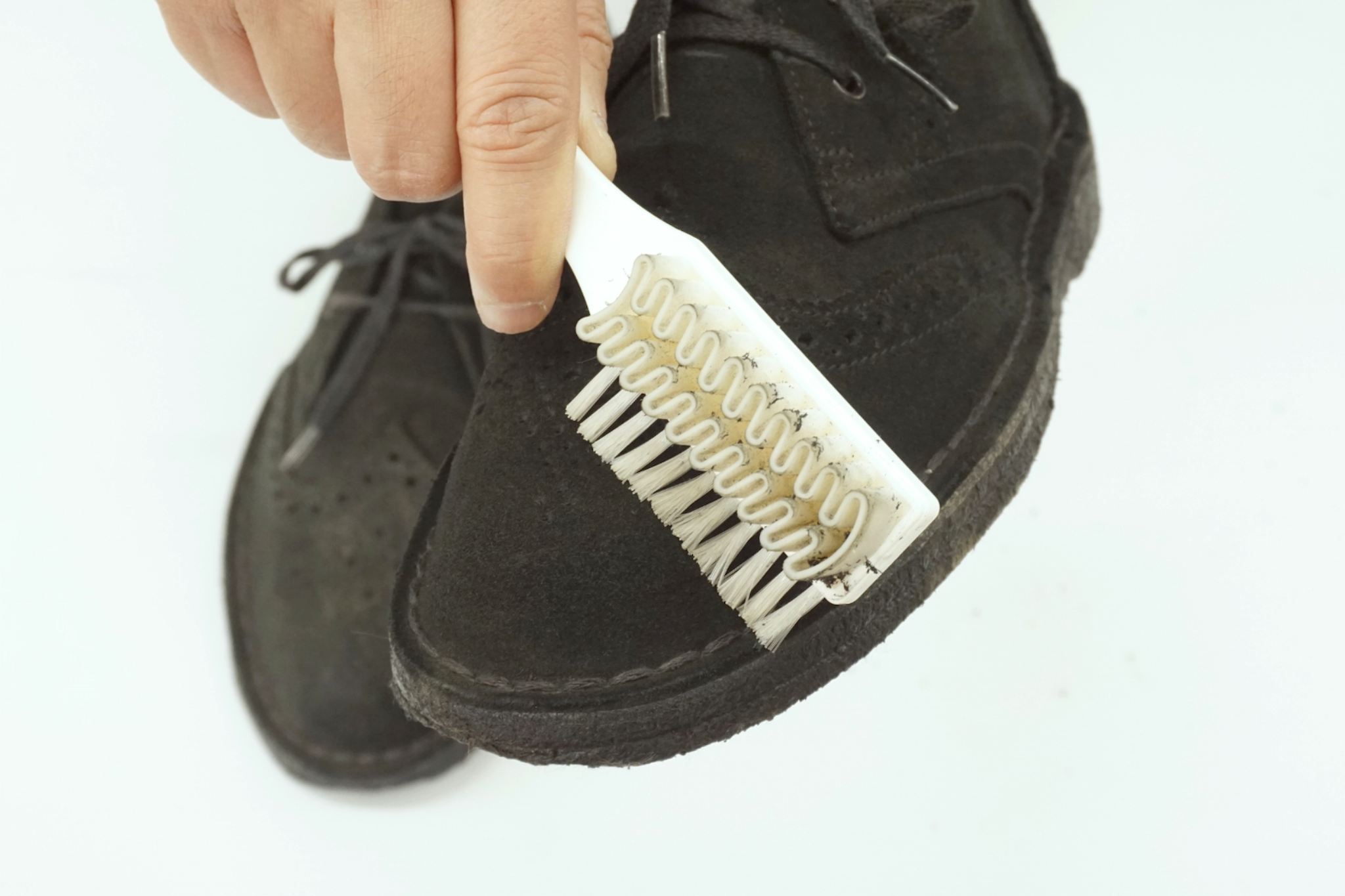 1.ナイロンブラシの方で、起毛革の表面についた汚れなどを取り除いてください。