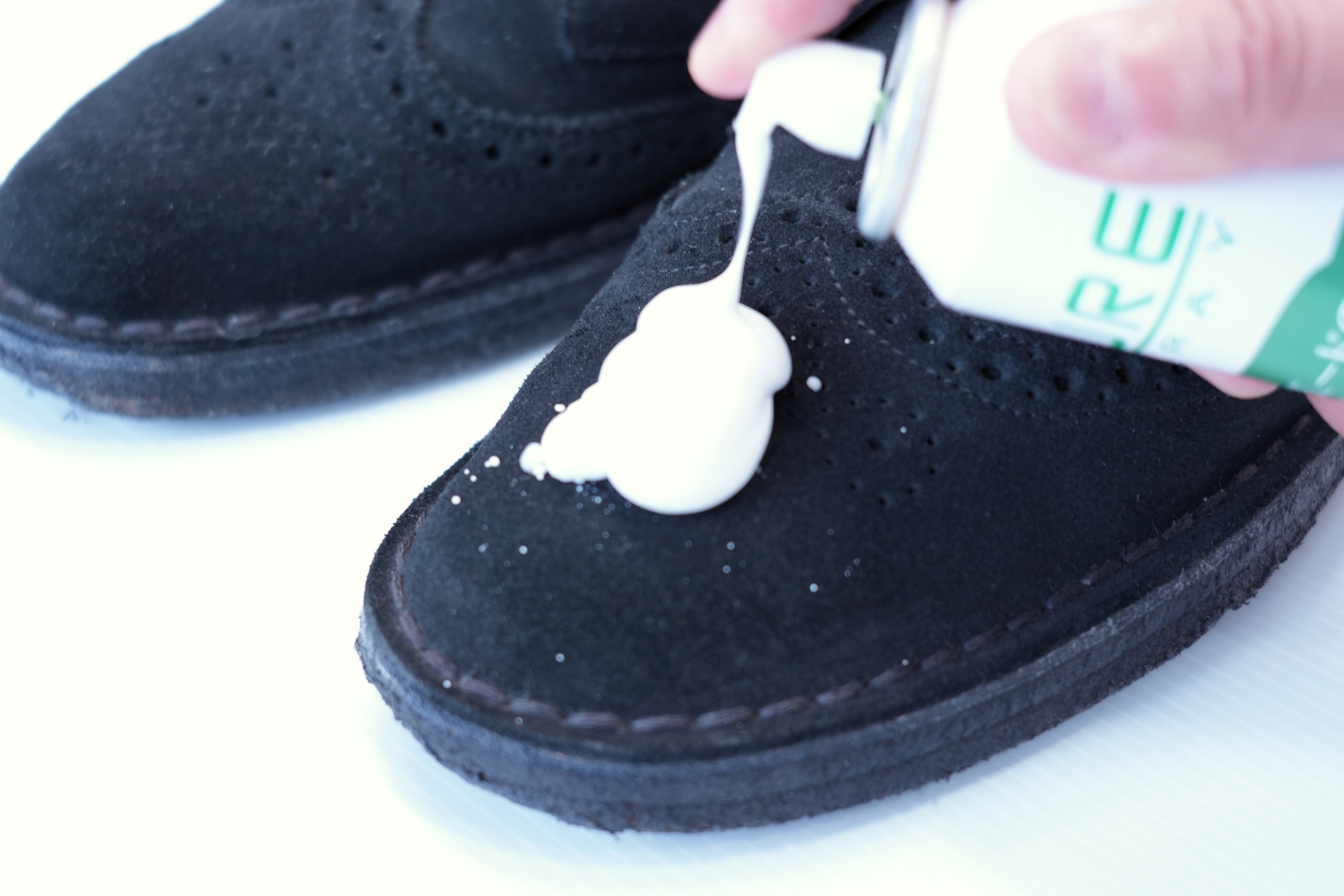 2.ボトルを上下によく振ってから、起毛革の汚れた部分に泡をつけ、少し時間をおいてください。