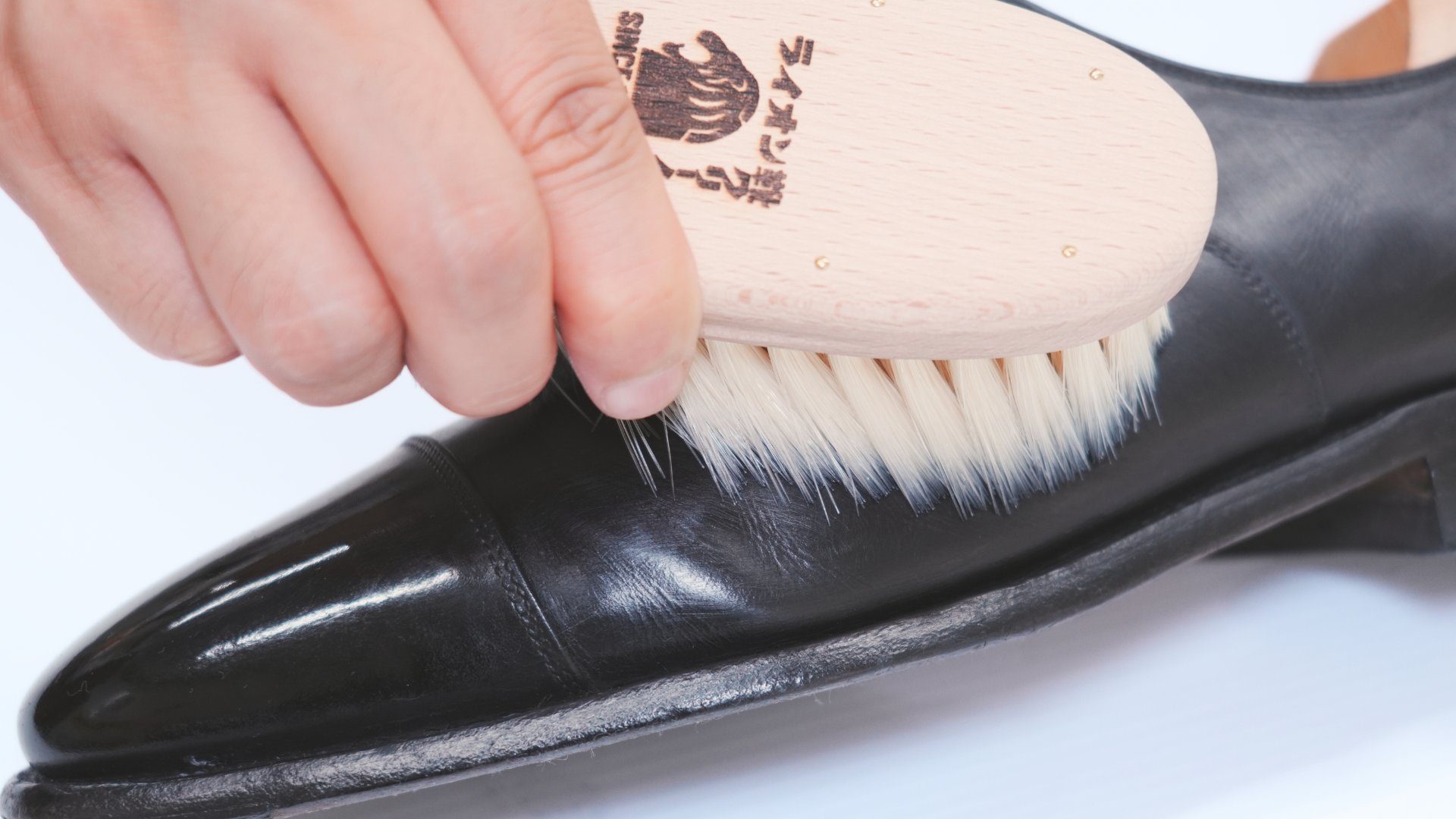 適度な長さのコシのある豚の毛でブラッシングすることで、革靴にツヤを生み出します。